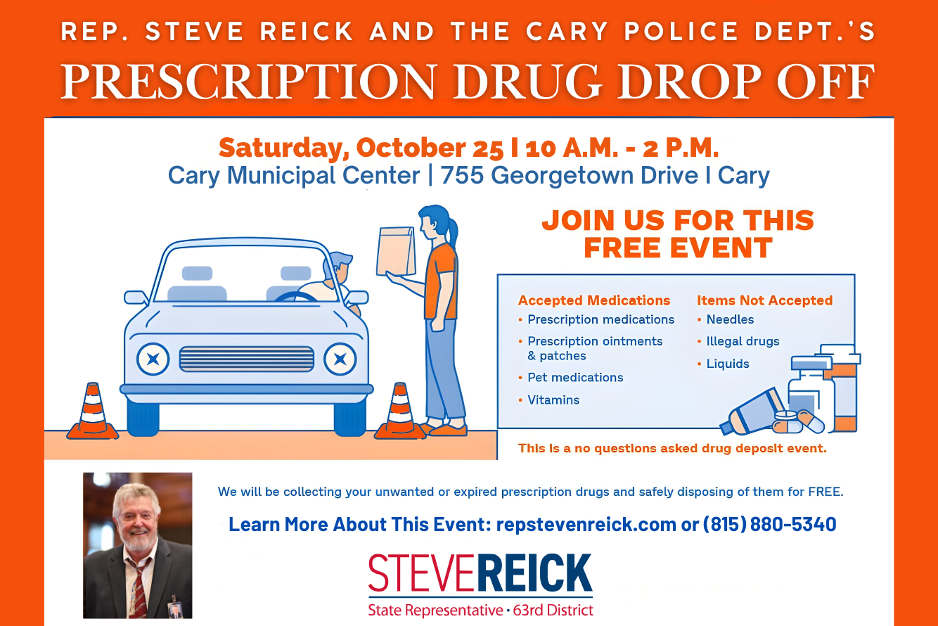 Cary, IL…State Representative Steve Reick (R-Cary), in partnership with the Cary Police Department, invites residents to safely dispose of unwanted or expired prescription medications during a free Prescription Drug Drop-Off Event on Saturday,…